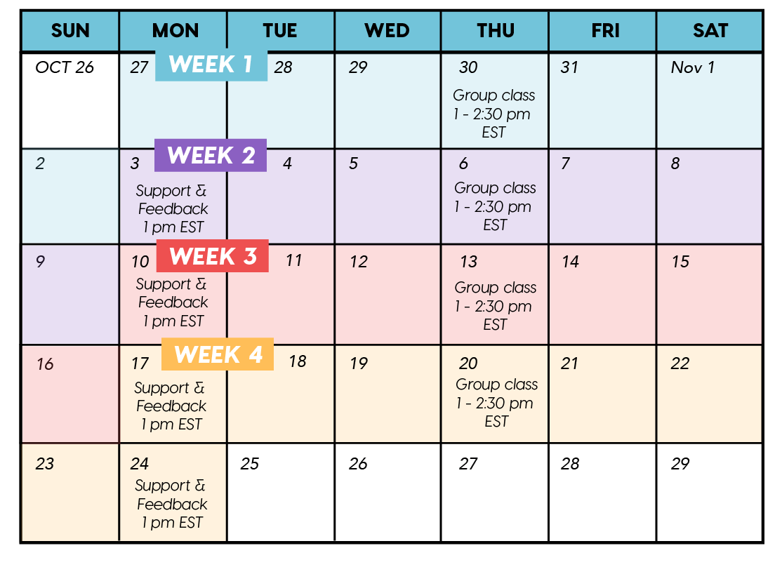 We'll have group Zoom classes on Thursdays, from 1-2:30 pm EST, and group support & feedback sessions on Mondays, from 1-2 pm EST. Starts Oct 27.
